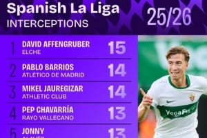 西甲拦截次数排行:巴里奥斯14次并列第2 琼阿梅尼12次并列第6